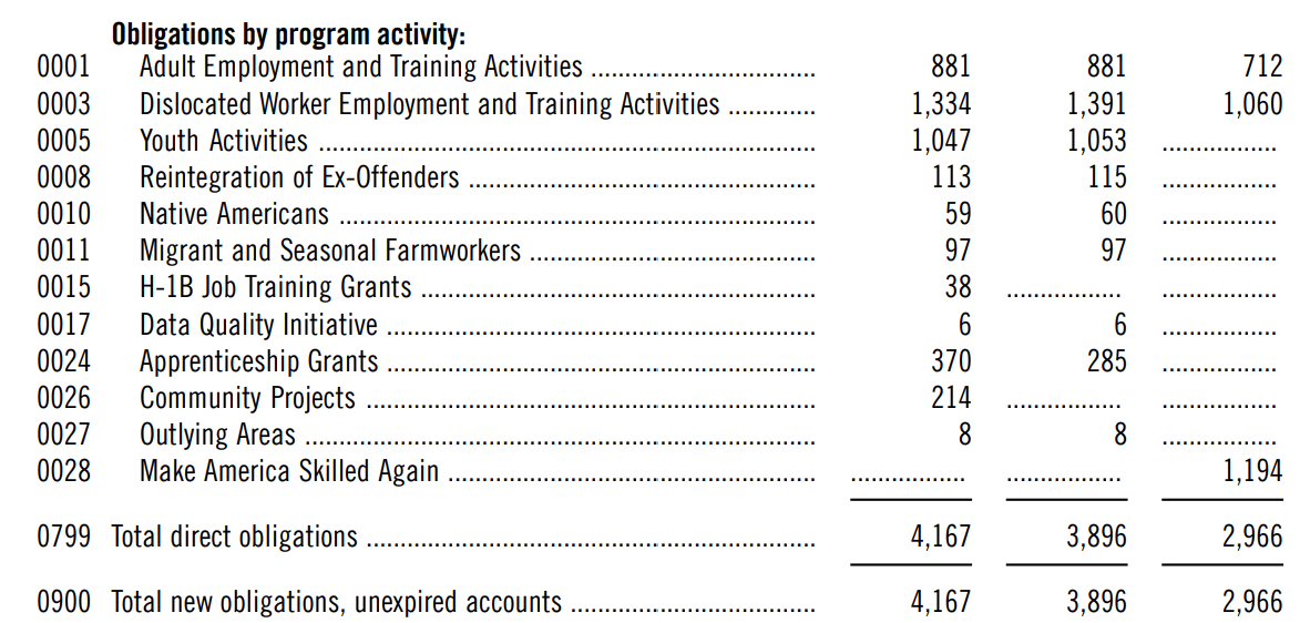 The proposal doesn’t replace those existing programs, but instead creates state-by-state block grants, with indications the Administration will shift many administrative costs carried by the federal government over to states. (Ignore the separate funding amounts for the Adult and Dislocated Worker formula programs at the very top of the table above. Budget documents indicate those dollars would be wadded into the block grants, too.)
